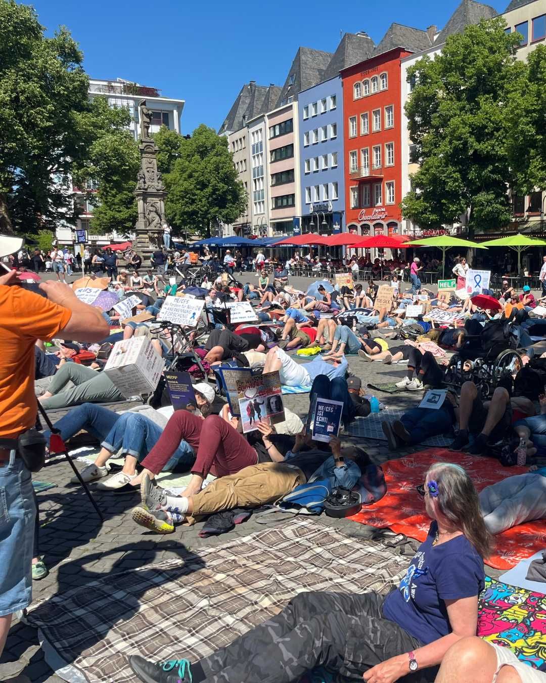 Sie heißt Liegenddemo, weil viele Teilnehmerinnen auf Isomatten liegen – stellvertretend für die schwer Erkrankten, die ihr Bett kaum oder gar nicht mehr verlassen können. Vor Ort waren sowohl Betroffene wie ich als auch Angehörige und Freundinnen. Die Polizei sprach von über 400 Teilnehmer*innen!