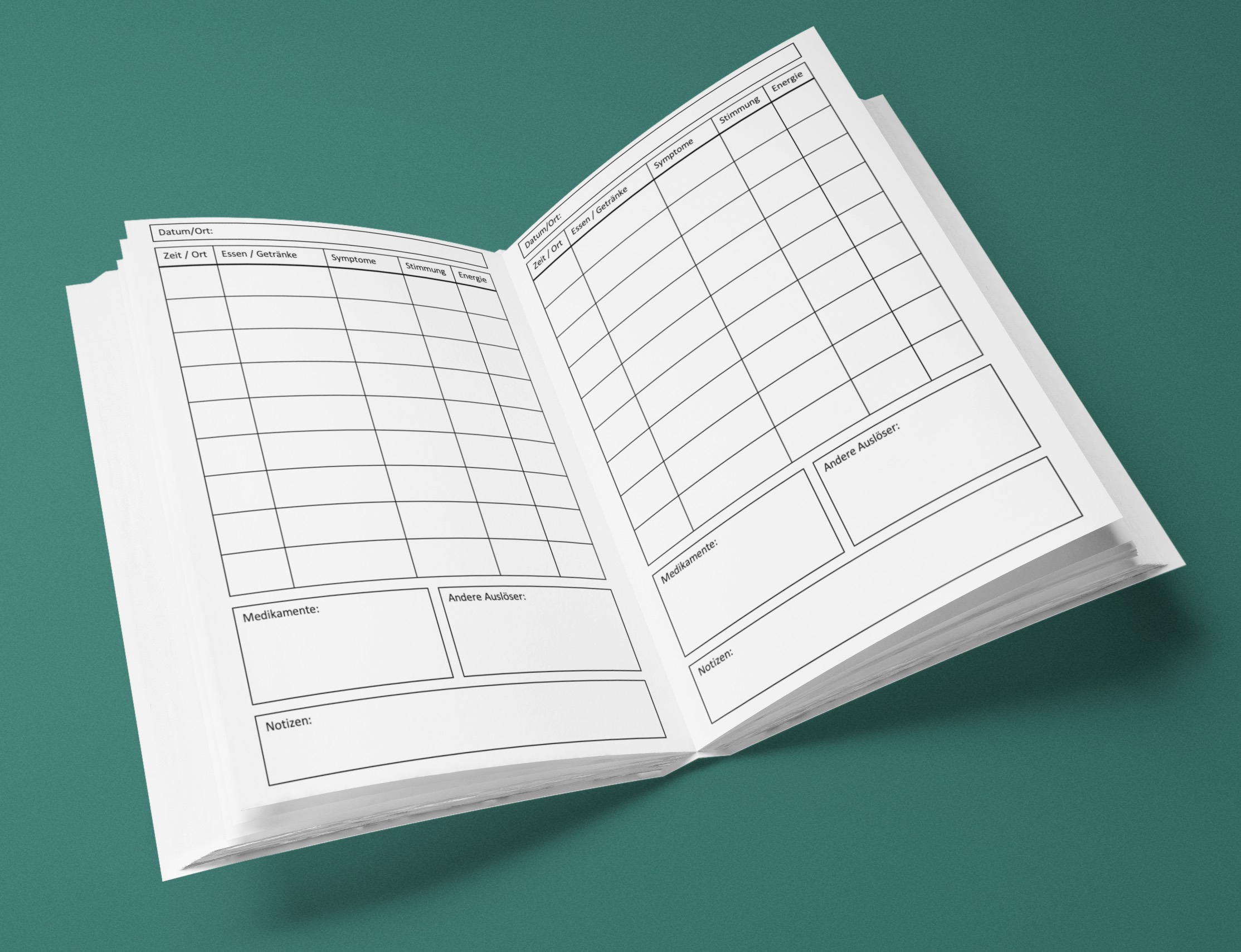Das Tagebuch ist einfach aufzufüllen. Jeder Tag hat eine eigene Seite, auf der du detailliert notieren kannst, was du gegessen hast und welche Symptome du erlebt hast. Zusätzlich gibt es 4 Ergebnisseiten, auf denen du die erkannten Lebensmittel und andere Stoffe eintragen kannst. Diese Seiten bieten eine schnelle Übersicht über deine Entdeckungen.